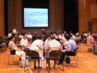 | 岡山市の未来について考える「市民みらい懇談会」に生徒会執行部と有志で参加しました。懇談会には,中学生,高校生,社会人など約50名が参加されており,6〜7人グループに分かれ,岡山市の資源や未来について話し合いました。グループの司会や発表の役割を行うことで,話を聞き,まとめ,発表する貴重な体験をすることができました。 |