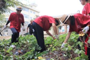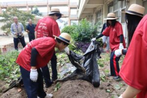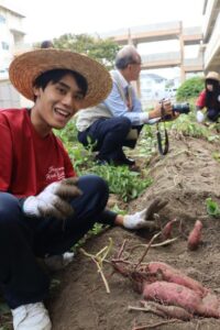 6月からスタートしたサミバ計画では、雑草を抜き取る作業から始まり、堆肥をいただき、農業を営んでおられる方からのアドバイスをいただきながら、土壌を作りました。そして芋の苗を植えてから約4か月。はじめは不安を感じるほど元気のない状態の苗でしたが、どんどん葉がしげり、敷地を埋めつくほどになりました。その葉を刈り取り、芋の収穫を行いました。