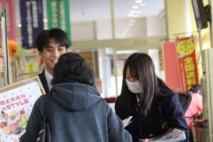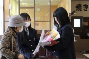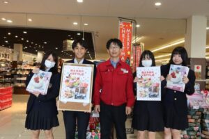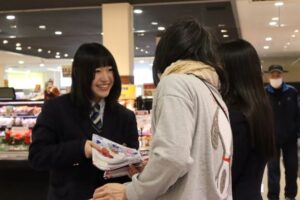 企画開発したクリスマスケーキが掲載されているカタログを、おかやまコープ西大寺店に訪れたお客様に手渡しさせていただきました。
