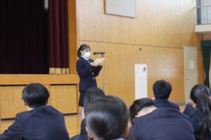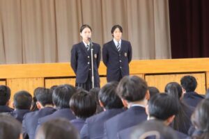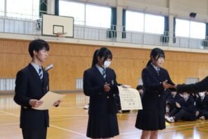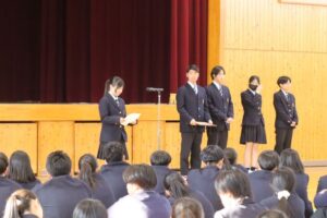 表彰伝達では、資格取得者やコンテストで優秀な成績を収めた代表生徒から、感想や決意を伝えました。英語スピーチコンテストに出場した生徒も、スピーチを披露しました。これらは、後輩たちにとって大きなアドバイスとなったと思います。