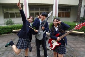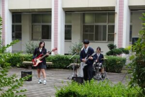 フォークソング部が中庭コンサートを開催しました。商業科バンド「エクセル戦士たち」