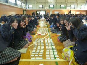 1月23日、体育館にて開催された百人一首大会は、大変盛り上がり熱気に包まれた会となりました。運営はすべて図書委員が行いましたが、事前の準備から当日の進行、一組から順番に担当の札を詠み上げ、さらには事後の片付けと集計まで、協力し合って行いました。 学年の交流と親睦を図り、伝統文化のカルタに親しむ機会となりました。朗々と歌を詠む図書委員の声が響く中、和やかな笑い声と歓声が沸き上がりました。