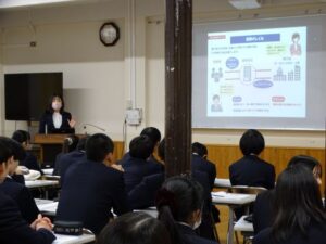 商業科はおかやま信用金庫様に、普通科はジブラルタ生命株式会社様に、国際情報科はSMBCコンシューマーファイナンス株式会社様に依頼し、それぞれにポイントを絞ってお話をしていただきました。