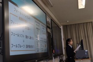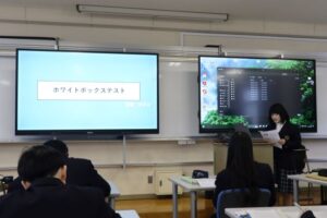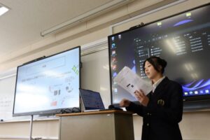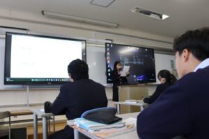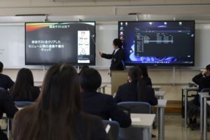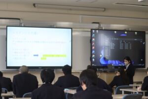 商業科1年生の情報処理の時間に、大型モニタを使ってプレゼンをしました。