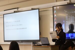 前回の授業で、情報処理に関する用語をそれぞれ1人が一つ分担し、パワーポイントで資料を作成したものを、5人一組でプレゼンをしました。本日は5人の中から一人代表者を決め、その代表者が全員の前でプレゼンしました。