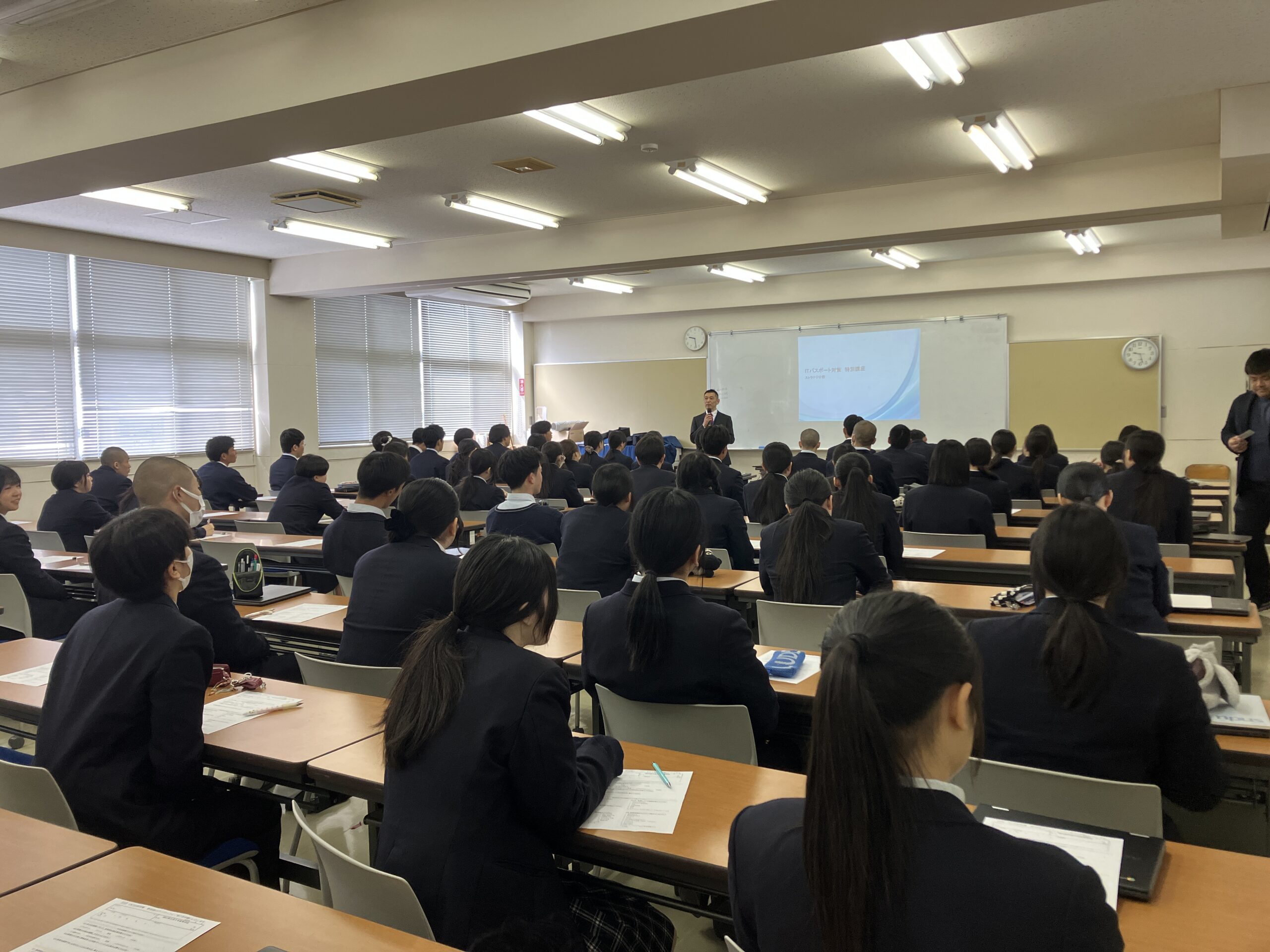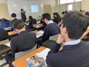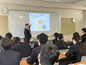 「ITパスポート講座」を、岡山情報ビジネス学院の岡本先生をお招きして実施しました。講座では、ストラテジ・リテラシー・AIについて学び、企業の実態や身近な生活に結び付けながら理解を深めました。講義では、単なる知識の習得にとどまらず、実社会でどのように活用されているのかを具体的に学ぶことができ、実社会とのつながりを意識しながら、実践的な学びにつながる有意義な時間となりました。