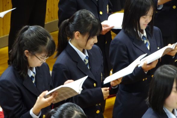 生徒会長からの歓迎の言葉に始まり、生徒会執行部全員からの挨拶、1年生からの挨拶、そして校歌、第一応援歌斉唱という流れで行いました。